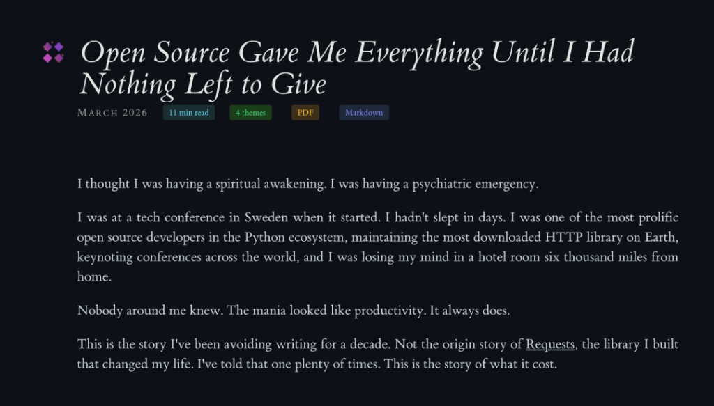 mercredi 18 mars 2026 à 21:53Kenneth Reitz, si vous ne le connaissez pas, c'est le gars qui se trouve derrière Requests , la librairie HTTP Python la plus téléchargée au monde. Ce projet a généré des milliards de downloads sur PyPI et aujourd'hui, Kenneth a publié un post de blog qui devrait, je pense, être lu par tous ceux qui donnent de leur temps sur Internet.