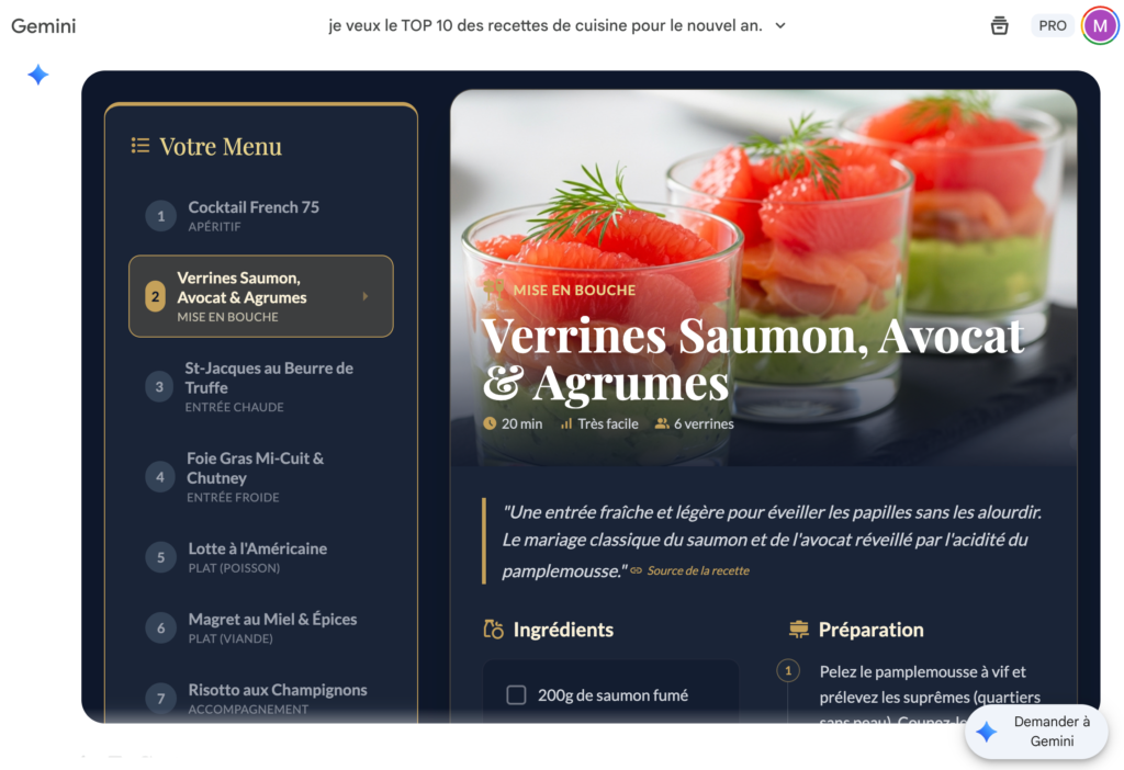 Imaginez 2 secondes les usages de cette techno... Vous cherchez quel GPU acheter pour votre config gaming ? Au lieu de parcourir 15 sites de benchmarks, de comparer des tableaux sur Tom's Hardware et de croiser avec les prix sur LDLC, vous posez la question à Gemini et vous obtenez une application comparative générée instantanément. Même chose pour choisir un forfait mobile, comprendre les différences entre distributions Linux, trouver la meilleure recette de carbonara, ou planifier un voyage avec maps et itinéraires intégrés.