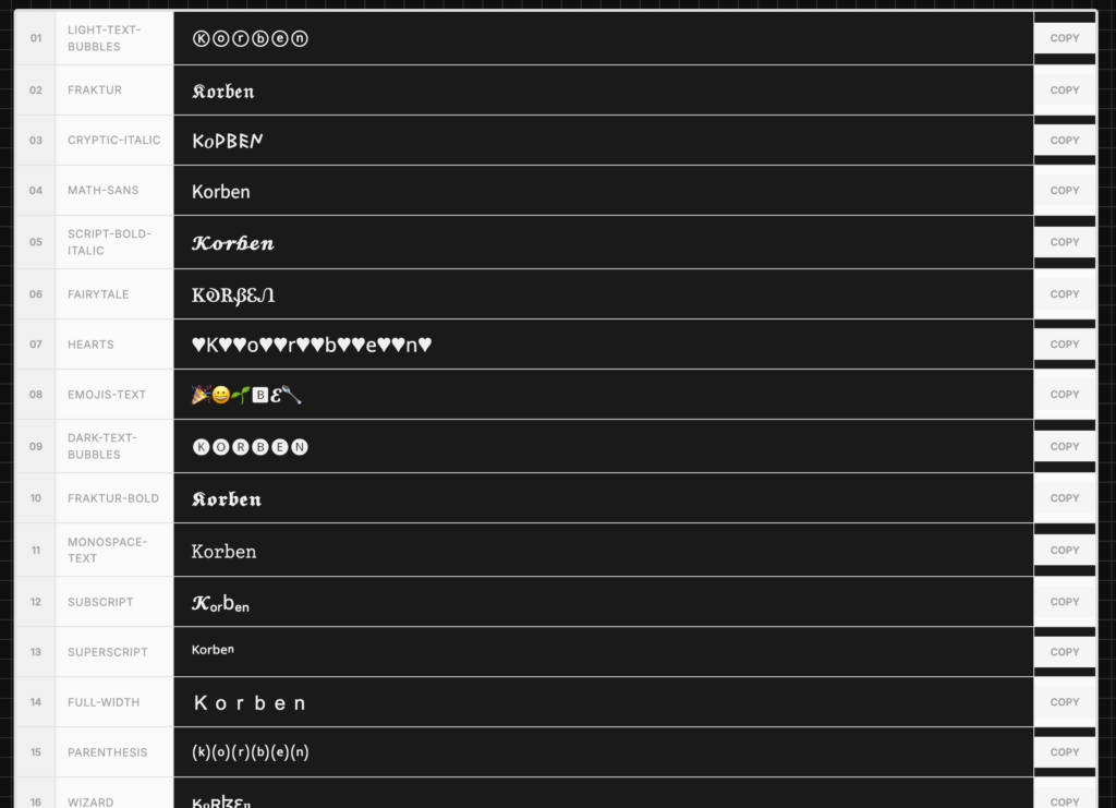 Ce qui est cool, c'est que tout ça repose sur des caractères Unicode. Concrètement, ça veut dire que ce ne sont pas de vraies polices au sens technique, mais des caractères spéciaux qui existent déjà dans la norme Unicode. Résultat, pas besoin d'installer quoi que ce soit, ça fonctionne partout où l'Unicode est supporté (spoiler : QUASIMENT PARTOUT). Vous copiez, vous collez, et ça s'affiche correctement.
