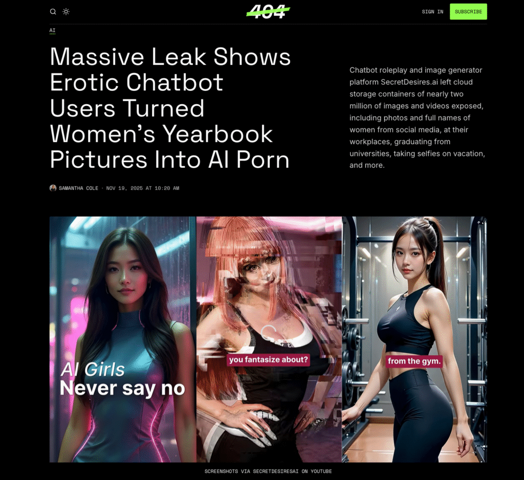 La plateforme SecretDesires.ai, un service de chatbot érotique avec génération d’images par IA, a laissé fuiter dans la nature près de 2 millions de photos et vidéos dans des conteneurs Azure pas du tout sécurisés. Hé oui, n’importe qui pouvait y accéder via de simples fichiers XML contenant tous les liens vers les images, et ça ont le sait grâce à cette enquête de 404 Media .