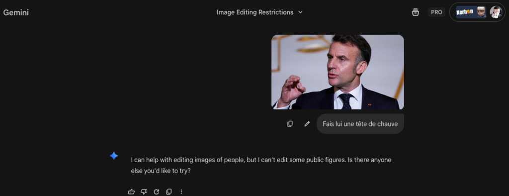 Vous avez sans doute remarqué que dès qu'on demande à Nano Banana de bosser sur des photos de personnalités publiques, ou même juste de gens normaux, il se braque direct. Le machin vous sort son petit message pré-enregistré genre : "I can help with editing images of people, but I can't edit some public figures. Is there anyone else you'd like to try?".