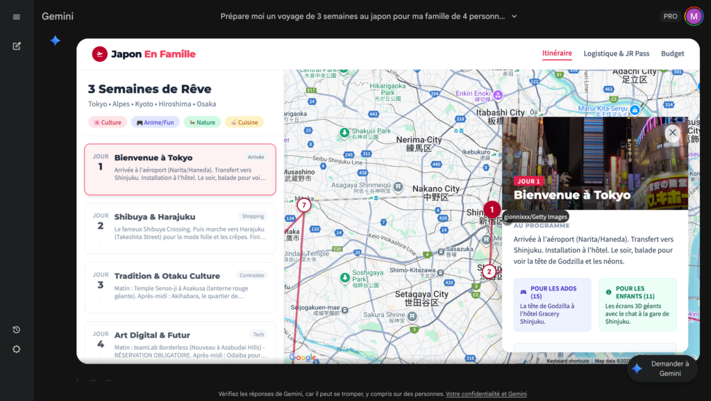 Et ça fonctionne incroyablement bien sur le web via gemini.google.com ! Pour l'instant c'est réservé aux comptes personnels, c'est encore un peu capricieux (ça apparaît, ça disparaît, Google teste), et ça peut prendre entre 30 et 90 secondes pour générer une réponse complexe. Mais le résultat est vraiment bluffant.