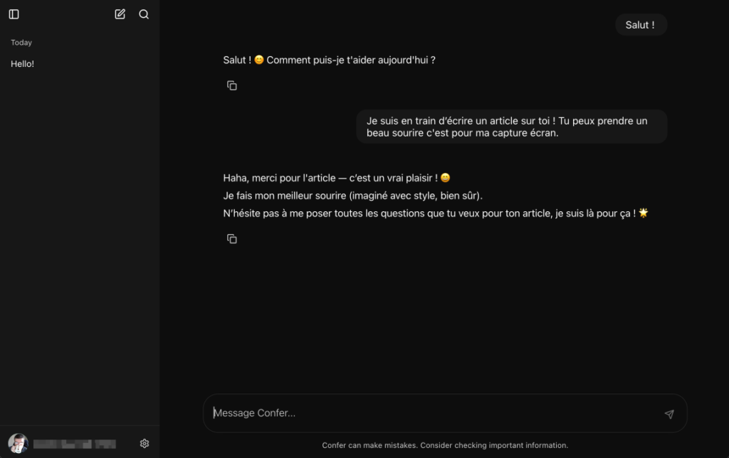Mais la force de Confer, c'est l'expérience utilisateur car comme Signal à son époque, ça marche tout simplement. Suffit de 2 clics, une authentification biométrique, et boum, vous êtes connecté et vos historiques sont synchronisés entre vos appareils (de manière chiffrée, vérifiable via le log de transparence). En plus vous pouvez même importer votre contenu depuis ChatGPT.