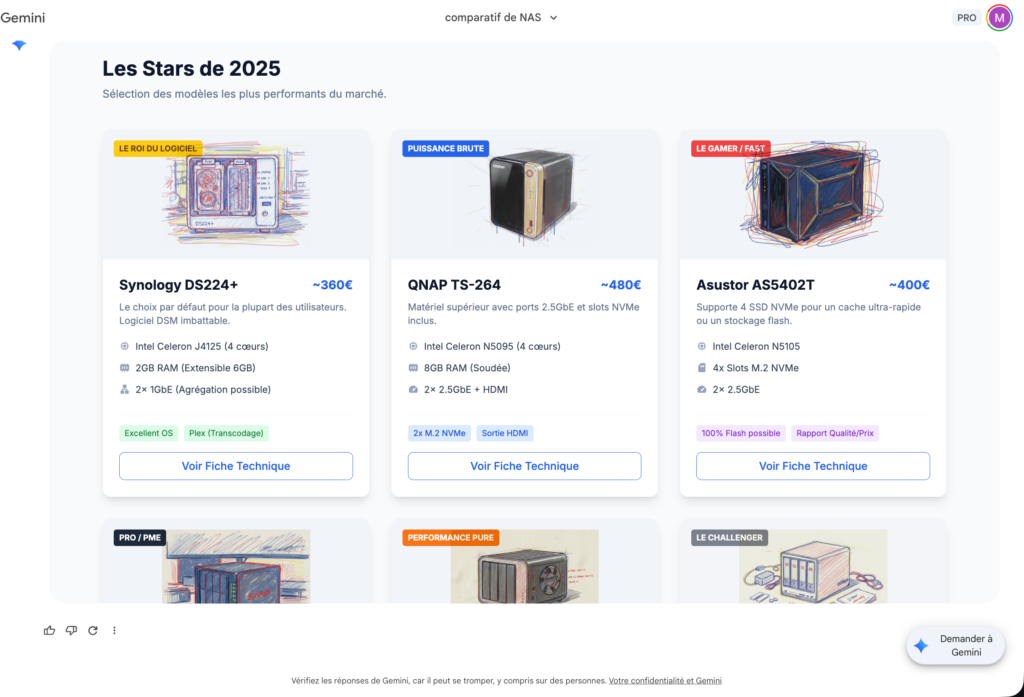 Vous demandez un comparatif de NAS ? Vous n'obtenez pas un texte avec des bullet points. Vous obtenez une interface avec des onglets, des sliders pour filtrer par prix, des cartes interactives avec les specs de chaque modèle.