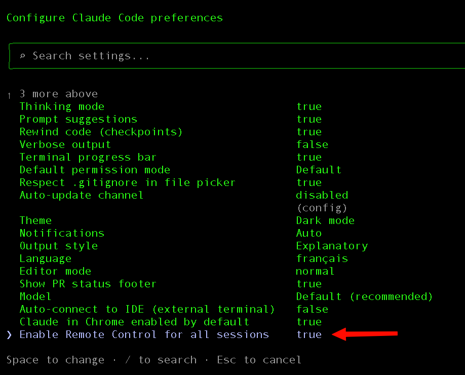 Maintenant, si vous voulez que CHAQUE session Claude Code soit automatiquement accessible à distance, tapez /config dans une session Claude Code, puis activez l'option "Enable Remote Control for all sessions". Et voilà, plus besoin d'y réfléchir ! Chaque claude lancé dans un terminal sera pilotable depuis votre navigateur ou l'app mobile.
