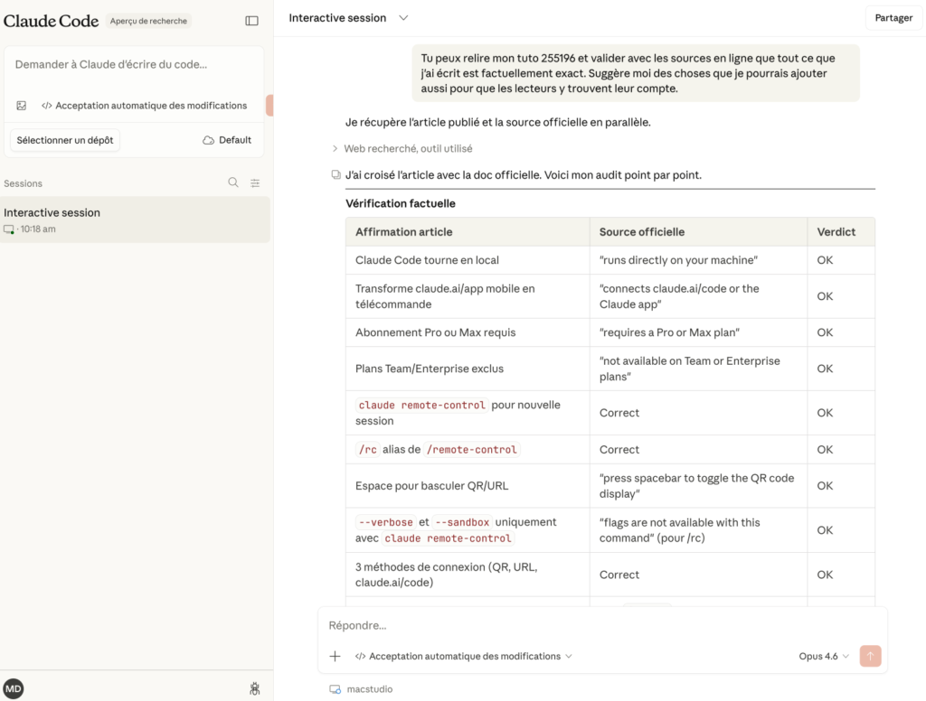 Une fois connecté, vous récupérez votre conversation en cours, vos fichiers, votre contexte... tout. Vous pouvez envoyer des messages, voir les résultats, approuver les modifications de fichiers. Bref, comme si vous étiez devant votre terminal, sauf que vous êtes dans votre canapé, votre lit ou en train de pousser le caddie chez Auchan !