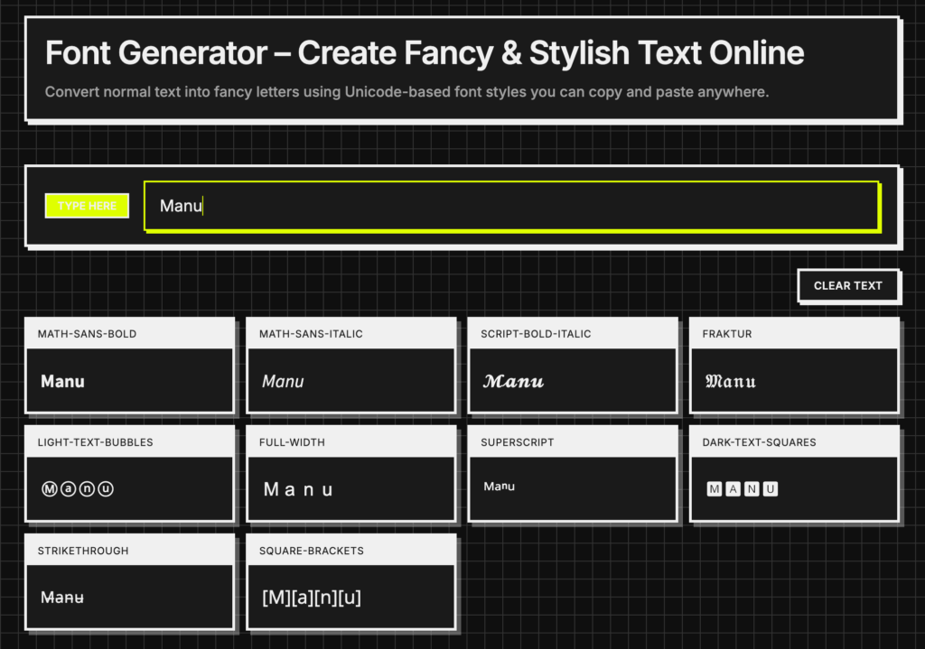 Vous tapez votre texte dans la case, et hop, l'outil vous génère instantanément des dizaines de variantes : polices Script Bold Italic, Fraktur (style Old English), texte dans des bulles, lettres barrées, superscript, et j'en passe. Du coup, vous scrollez les styles disponibles, vous trouvez celui qui vous plaît, et vous le copiez-collez directement où vous voulez. Ça marche sur Instagram, Discord, Twitter/X, et même dans les jeux comme Roblox ou Fortnite.