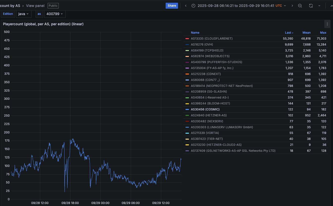 Traces from the recent spate of crippling Aisuru attacks on gaming servers can be still seen at the website blockgametracker.gg, which indexes the uptime and downtime of the top Minecraft hosts. In the following example from a series of data deluges on the evening of September 28, we can see an Aisuru botnet campaign briefly knocked TCPShield offline.