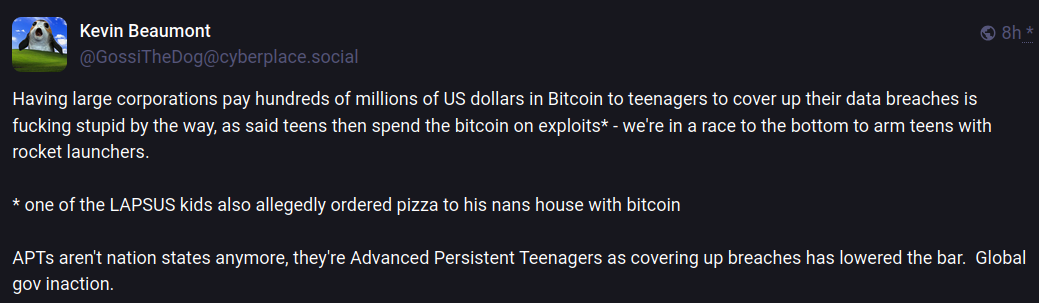 The Aisuru botnet harkens back to its predecessor Mirai in another intriguing way. One of its owners is using the Telegram handle “9gigsofram,” which corresponds to the nickname used by the co-owner of a Minecraft server protection service called Proxypipe that was heavily targeted in 2016 by the original Mirai botmasters.