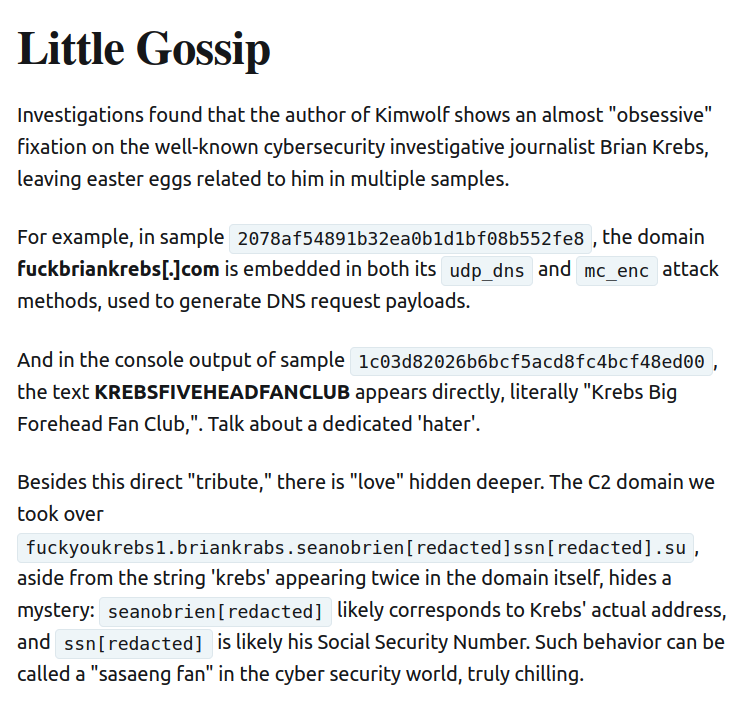 XLab noted that the Kimwolf author “shows an almost ‘obsessive’ fixation on the well-known cybersecurity investigative journalist Brian Krebs, leaving easter eggs related to him in multiple places.”